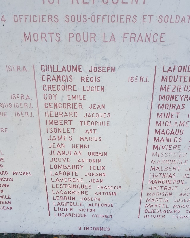 | 29 | LABOUREYRAS | Francisque-Jean | Soldat | 16e R.I | |